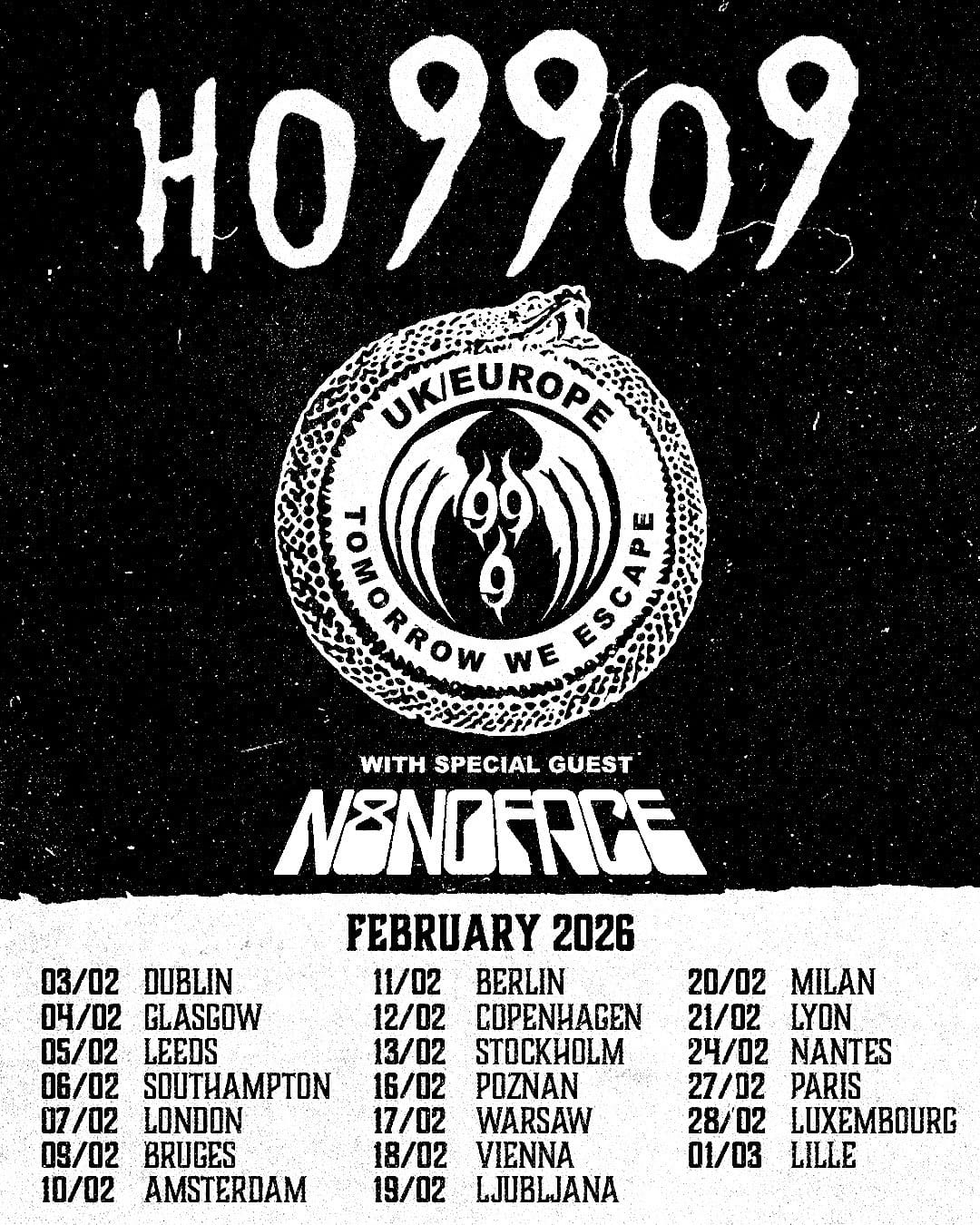Beware anyone who ain't ridin' wit' the Triple-Nine: genre-defying duo Ho99o9 are set to take their exhilarating blend of techno, rap, and punk across the pond with supporting guest N8NOFACE. Starting in February, the month-long tour will celebrate their thrilling new album, Tomorrow We Escape. In addition to MCs Yeti Bones and theOGM, Ho99o9 live shows feature drummer Billy Rymer (The Dillinger Escape Plan, NK, No Machine, thoughtcrimes).