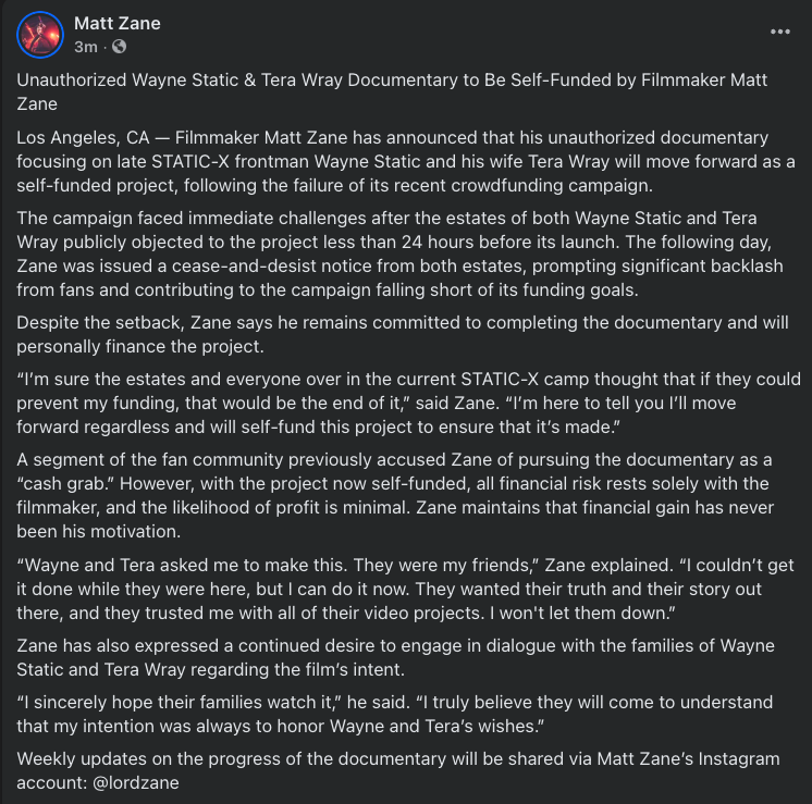 Filmmaker Matt Zane has stood his ground in regards to producing a documentary about the life of late Static-X frontman Wayne Static and his late wife, Tera Wray Static. It has been heavily objected by both families, and they have publicly expressed their disdain for the continuation of the project. Zane refuses to give up on fulfilling the wishes of his deceased friends, even after receiving a cease and desist from both family estates. Wray's former roommate and close friend has even showed her support for Zane's documentary.