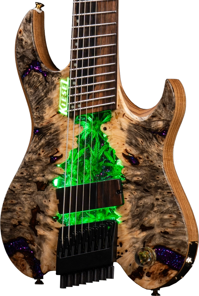 Stef Carpenter's new Vader takes dope to a whole new level. Putting genuine, freshly cut buds and leaves on full display, the "Dope" guitar joins the likes of the Sushi guitar as a resin-filled, themed instrument. Further outfitted with LEDs — a first for Kiesel Guitars — and top-tier woods, Carpenter's Vader stands out among the other Custom Shop creations.