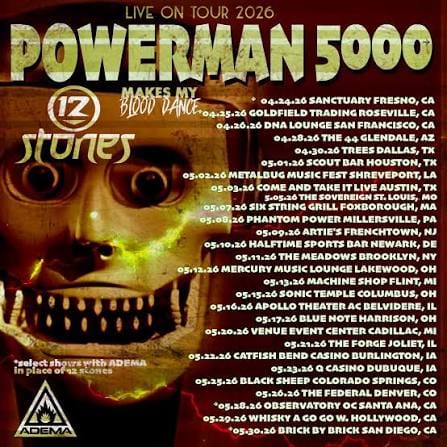 Powerman 5000 will be playing Louder Than Life this September in Louisville, KY. Currently, they are gearing up to go on tour with Makes My Blood Dance and 12 Stones this spring, with the following dates announced. Note that Adema will fill in for 12 Stones on select dates: