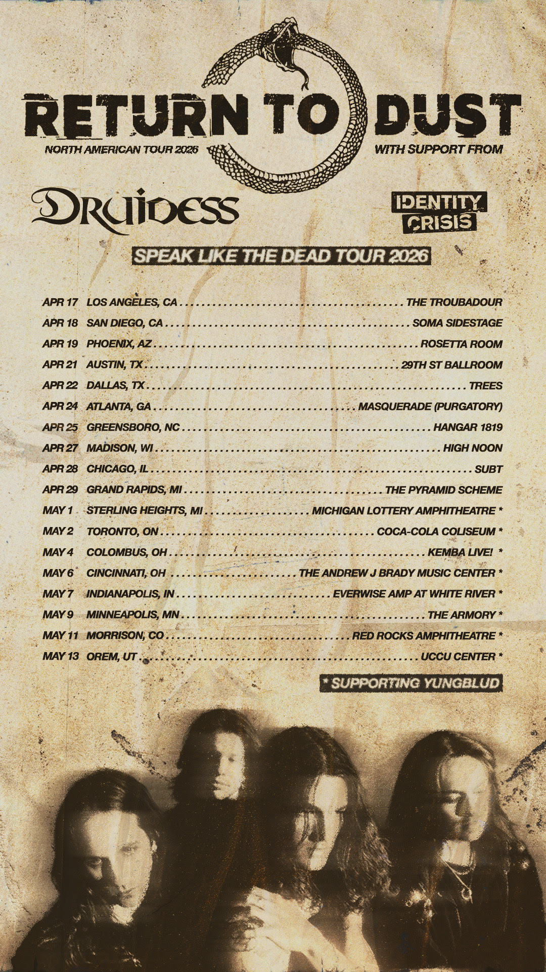 Currently, Return to Dust are touring with Druidess and Identity Crisis. In just a couple weeks, they'll be supporting YUNGBLUD on their upcoming US leg of their IDOLS tour, before traveling Europe with Breaking Benjamin and Chevelle in June. RTD's dates for this year are as follows: