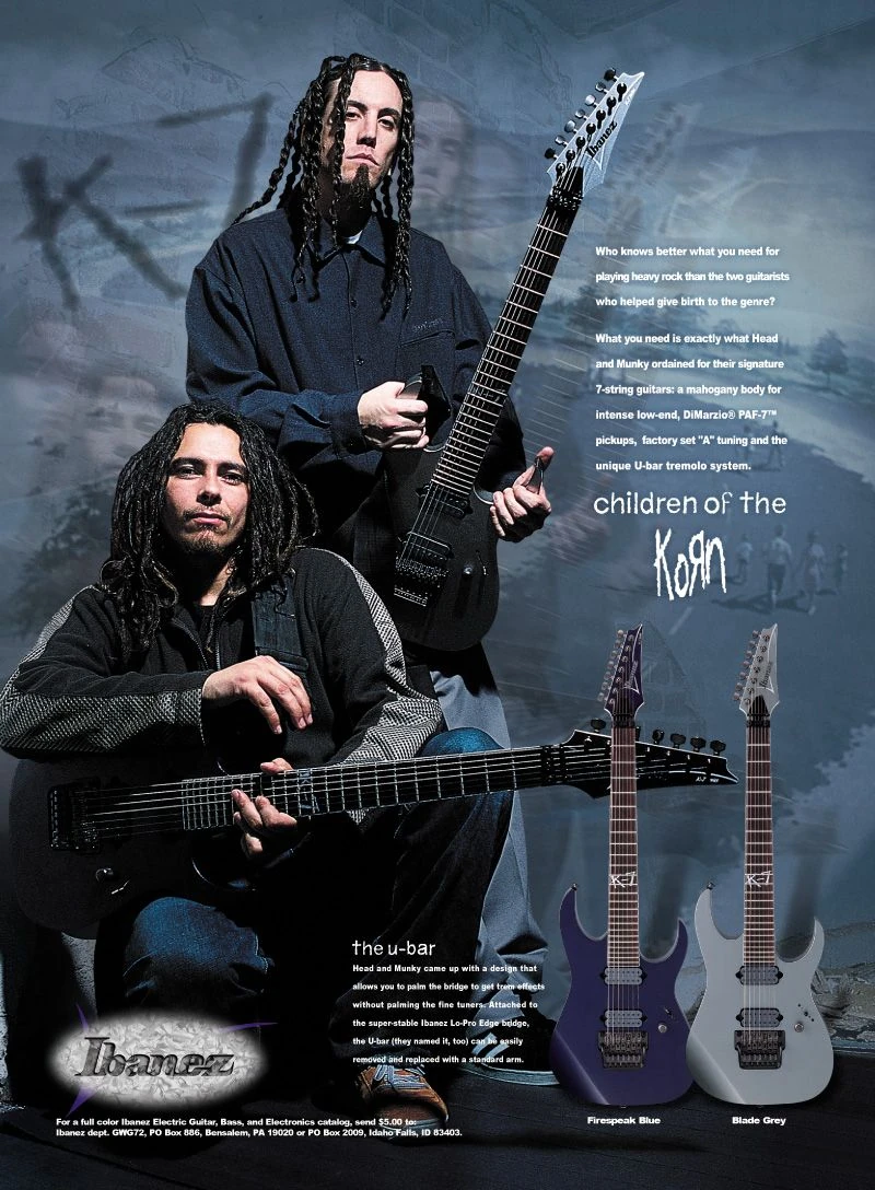 Ironically, Ibanez discontinued the seven-string just as Korn's debut album was about to come out. Munky admits, "It was a little discouraging at first." It was only after the release and success of Korn's self-titled album that the company was inundated with calls and demands for seven-string guitars. Even Steve Vai took notice. Upon hearing Korn on the radio, the world-class shredder "actually pulled the car over and just stopped and listened with my mouth open." Munky beams, "[it was] like a real childhood dream come true." "What an honor to be able to be that band that he wanted, to make his seven-string play like he envisioned it. It's surreal, man" adds Head. The band even got a chance to jam in the studio with Vai in 1998. The session was documented online in an episode of the band's KoRnTV.