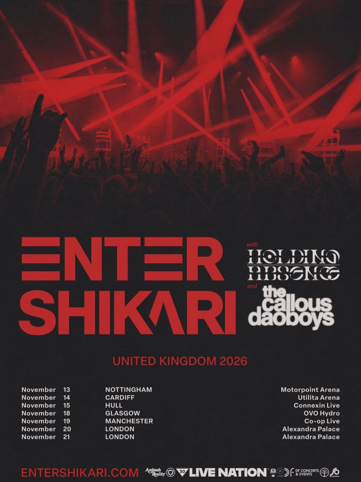Starting in November, The Callous Daoboys, along with Holding Absence, will support Enter Shikari on their biggest ever European/UK arena tour. £1 from every ticket will be donated to LIVE Trust to help support grassroots venues. Artist presale starts Wednesday January 28th at 10am GMT with general tickets going on sale Friday January 30th at 10am GMT.