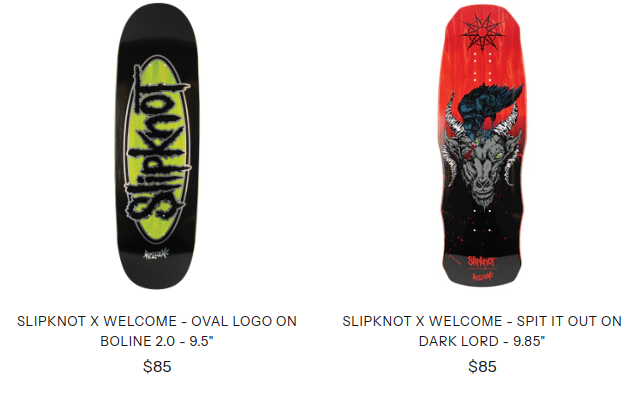 Metal juggernauts Slipknot have teamed together with skateboard brand Welcome to create a new collection consisting of two skate decks, four distinct T-shirt designs, two different hoodies, a baseball cap, and even a water bottle. All of the merchandise stays within the color palette of black, red, lime green, purple, tan, and even includes a couple of camo patterned items. Slipknot aren't new to the skateboard game, as they released their own skate decks earlier this year.
