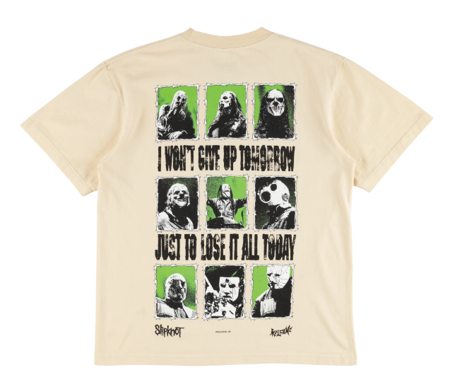 Vol. 3: (The Subliminal Verses) is also represented in this collection, with one of the hoodies featuring the special edition album cover. However, one of the shirts stands out because it is a mix of eras. The tan shirt has the lyrics "I won't give up tomorrow just to lose it all today" from the All Hope Is Gone special edition track "Child of Burning Time", but the pictures of the band members are from their current lineup.